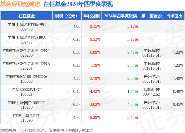 中银中证A100指数增强现任基金经理为赵建忠。其中在任基金经理赵建忠已从业9年又232天,2015年6月8日正式接手管理中银中证A100指数增强,任职期间累计回报为27.01%。目前还管理着8只基金产品(包括A类和C类),其中本季度表现最佳的基金为中银上海金ETF(518890),季度净值涨幅为3.45%。
