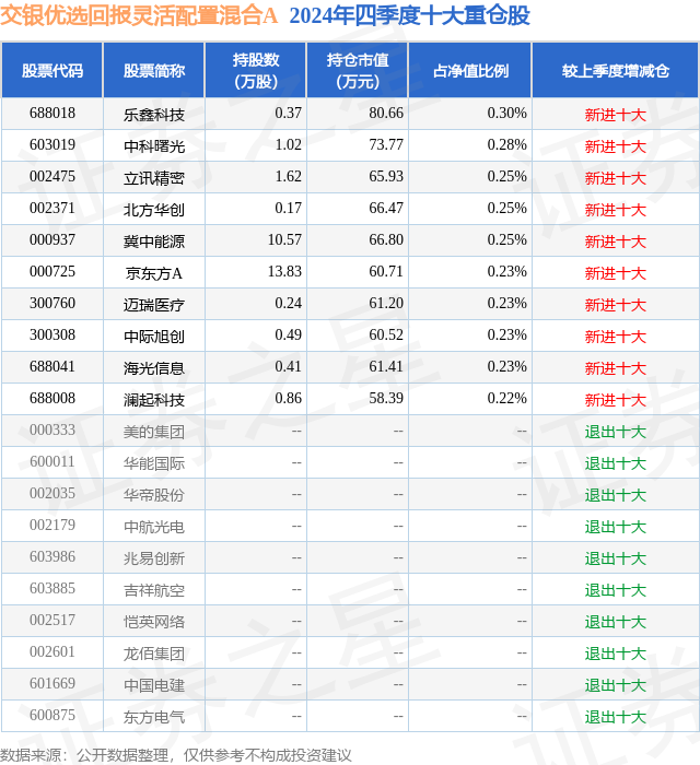 从基金规模来看,交银优选回报灵活配置混合A基金2024年四季度公布的基金规模为1.63亿元,较上一期规模2.09亿元变化了-4622.82万元,环比变化了-22.13%。该基金最新一期资产配置为:股票占净值比15.72%,债券占净值比87.03%,现金占净值比1.26%。从基金持仓来看,该基金当季前十大股票仓位达2.47%,第一大重仓股为乐鑫科技(688018),持仓占比为0.3%。