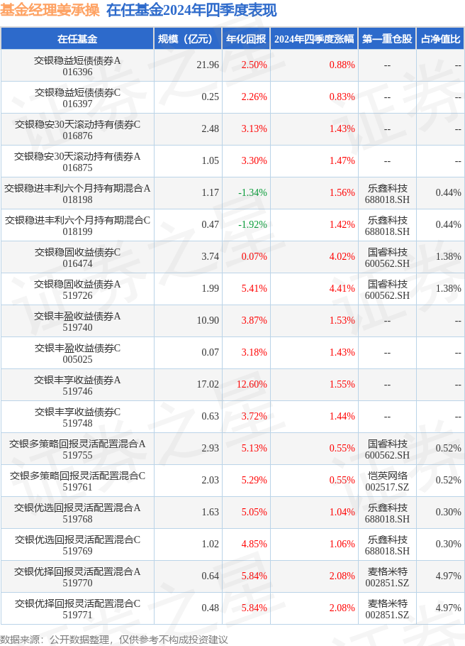 证券之星消息,日前交银优选回报灵活配置混合A基金公布四季报,2024年四季度最新规模1.63亿元,季度净值涨幅为1.04%。