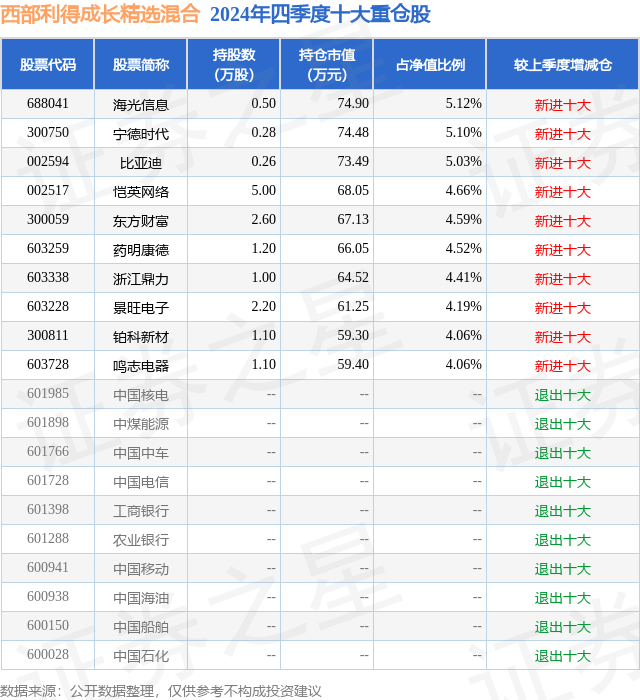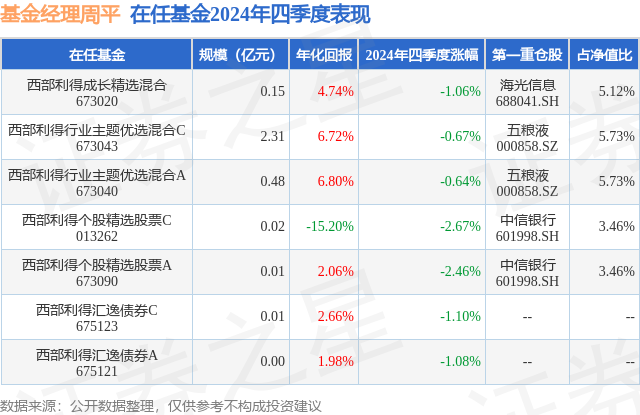 证券之星消息,日前西部利得成长精选混合基金公布四季报,2024年四季度最新规模0.15亿元,季度净值涨幅为-1.06%。