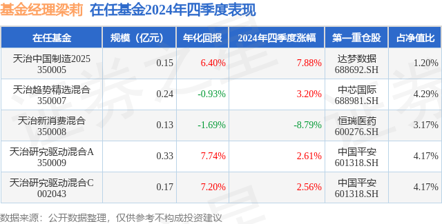 证券之星消息,日前天治新消费混合基金公布四季报,2024年四季度最新规模0.13亿元,季度净值涨幅为-8.79%。