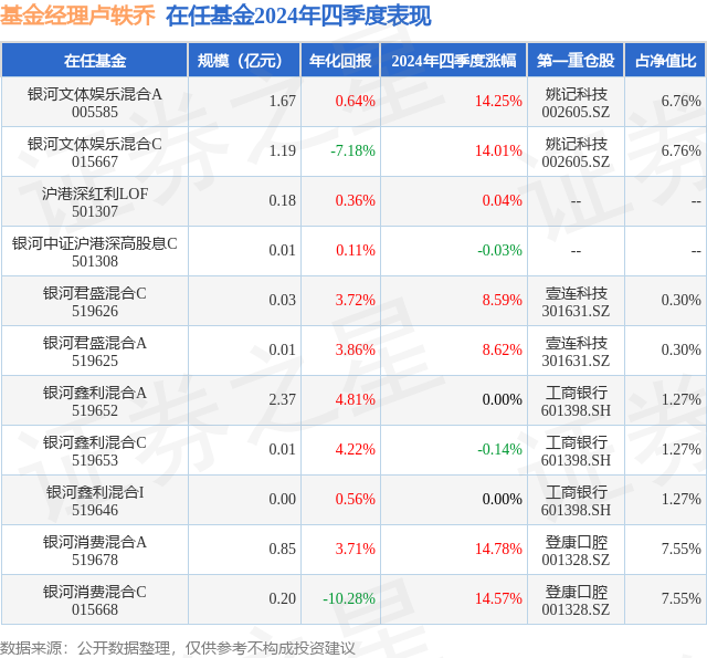 银河消费混合A现任基金经理为卢轶乔。其中在任基金经理卢轶乔已从业12年又36天,2012年12月21日正式接手管理银河消费混合A,任职期间累计回报为78.69%。目前还管理着11只基金产品(包括A类和C类),其中本季度表现最佳的基金为银河消费混合A(519678),季度净值涨幅为14.78%。
