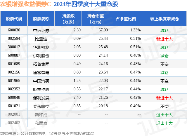 从基金规模来看,农银增强收益债券C基金2024年四季度公布的基金规模为0.28亿元,较上一期规模2096.34万元变化了659.82万元,环比变化了31.47%。该基金最新一期资产配置为:股票占净值比16.79%,债券占净值比86.4%,现金占净值比1.06%。从基金持仓来看,该基金当季前十大股票仓位达5.48%,第一大重仓股为中信证券(600030),持仓占比为1.33%。