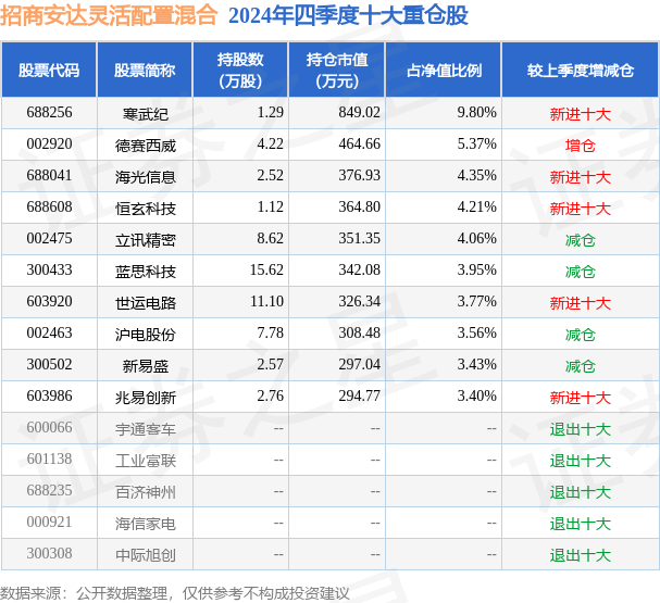 从基金规模来看,招商安达灵活配置混合基金2024年四季度公布的基金规模为0.87亿元,较上一期规模9367.89万元变化了-707.78万元,环比变化了-7.56%。该基金最新一期资产配置为:股票占净值比79.86%,债券占净值比24.28%,现金占净值比1.59%。从基金持仓来看,该基金当季前十大股票仓位达45.9%,第一大重仓股为寒武纪(688256),持仓占比为9.8%。