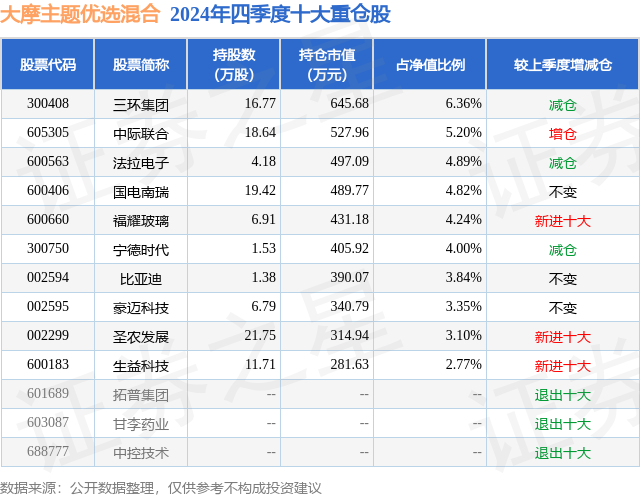 从基金规模来看,大摩主题优选混合基金2024年四季度公布的基金规模为1.02亿元,较上一期规模1.06亿元变化了-486.8万元,环比变化了-4.57%。该基金最新一期资产配置为:股票占净值比93.12%,债券占净值比3.77%,现金占净值比4.45%。从基金持仓来看,该基金当季前十大股票仓位达42.57%,第一大重仓股为三环集团(300408),持仓占比为6.36%。