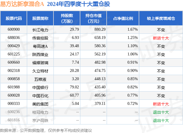 证券之星消息,日前易方达新享混合A基金公布四季报,2024年四季度最新规模3.46亿元,季度净值涨幅为1.99%。