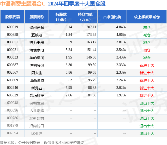 对本季度基金运作,基金经理的观点如下:1. 宏观经济分析 国外经济方面,全球总需求增速整体放缓,总供给延续扩张,不确定性因素增多,经济下行风险加大。全球通胀压力缓解,但通胀下行速度趋缓,反弹风险有所积聚。美国11月制造业PMI较9月回升1.2个百分点至48.4%,11月服务业PMI较9月回落2.8个百分点至52.1%,11月CPI同比较9月回升0.3个百分点至2.7%,11月失业率较9月上升0.1个百分点至4.2%,美联储在11月和12月各下调政策目标利率25bps至4.5%。欧元区经济表现分化,11月欧元区制造业PMI较9月抬升0.2个百分点至45.2%,11月服务业PMI较9月回落1.9个百分点至49.5%,11月欧元区调和CPI同比增速较9月回升0.5个百分点至2.2%,10月欧元区失业率6.3%持平9月,四季度欧央行两次降息共50bps。日本四季度经济延续温和复苏,11月CPI同比较9月抬升0.4个百分点至2.9%,11月制造业PMI较9月回落0.7个百分点至49%,11月服务业PMI较9月回落2.6个百分点至50.5%,四季度日央行未加息。 国内经济方面,在积极的政策定调下,经济基本面较三季度改善,社零和狭义基建增速修复,出口、制造业保持高增,地产投资拖累仍在。价格方面,CPI与PPI在低位徘徊。具体来看,中采制造业PMI连续三个月维持在荣枯线以上,12月值较9月值走高0.3个百分点至50.1%。11月工业增加值同比增长5.4%,与9月持平。从经济增长动力来看,出口仍有韧性,消费有所修复,投资有待进一步提振:11月美元计价出口增速较9月回升4.3个百分点至6.7%,11月社会消费品零售总额增速较9月回落0.2个百分点至3%。投资中基建投资修复,制造业投资维持韧性,房地产投资延续负增长,1-11月固定资产投资累计同比增速较1-9月回落0.1个百分点至3.3%。通胀方面,CPI维持在低位,11月同比增速从9月的0.4%回落0.2个百分点至0.2%,PPI负值小幅收窄,11月同比增速从9月的-2.8%回升0.3个百分点至-2.5%。 2. 市场回顾 四季度上证综指上涨0.46%,代表大盘股表现的沪深300指数下跌2.06%,中小板综合指数上涨2.56%,创业板综合指数上涨3.06%,代表消费板块的内地消费指数下跌7.37%。 3. 运行分析 在政策预期明显改善之后,四季度进入政策具体实施力度和效果的观察阶段,而消费板块由于短期高频数据并没有明显改善,整体出现一定下跌。组合仓位维持相对稳定。从行业选择上,维持配置两个方向:一是受益于政策加力支持的消费方向,12月政治局会议及中央经济工作会议明确提出要大力提振消费,后续政策有望持续支持,如受益于以旧换新政策相关的家电、汽车等,以及有望受益于以旧换新扩容的家居家纺等板块;二是估值处于底部但政策和基本面有望见底回升的地产、医药等。而从选股上,组合仍然重视确定性,重点配置需求景气确定性更高、持续性更强且竞争格局有改善的龙头公司。此外,我们还持续关注新兴消费需求的崛起。随着主力消费人群的变化,以及技术快速进步,一系列新兴消费需求崛起,这类公司值得长期关注。