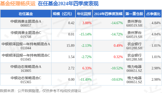 中银消费主题混合C现任基金经理为杨庆运。其中在任基金经理杨庆运已从业3年又39天,2023年10月18日正式接手管理中银消费主题混合C,任职期间累计回报为-18.72%。目前还管理着6只基金产品(包括A类和C类),其中本季度表现最佳的基金为中银顺泽回报一年持有期混合A(011044),季度净值涨幅为0.49%。