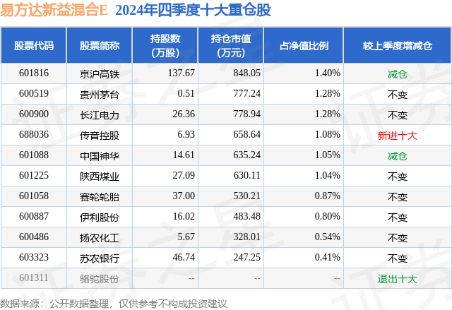 从基金规模来看,易方达新益混合E基金2024年四季度公布的基金规模为0.17亿元,较上一期规模2063.17万元变化了-320.59万元,环比变化了-15.54%。该基金最新一期资产配置为:股票占净值比11.58%,债券占净值比117.35%,现金占净值比1.24%。从基金持仓来看,该基金当季前十大股票仓位达9.75%,第一大重仓股为京沪高铁(601816),持仓占比为1.4%。
