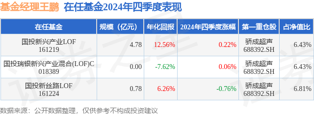 国投新兴产业LOF现任基金经理为王鹏。其中在任基金经理王鹏已从业9年又288天,2023年5月30日正式接手管理国投新兴产业LOF,任职期间累计回报为-10.96%。目前还管理着3只基金产品(包括A类和C类),其中本季度表现最佳的基金为国投新兴产业LOF(161219),季度净值涨幅为0.22%。