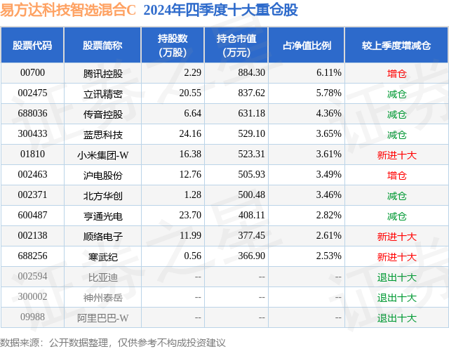 证券之星消息,日前易方达科技智选混合C基金公布四季报,2024年四季度最新规模0.87亿元,季度净值涨幅为0.56%。