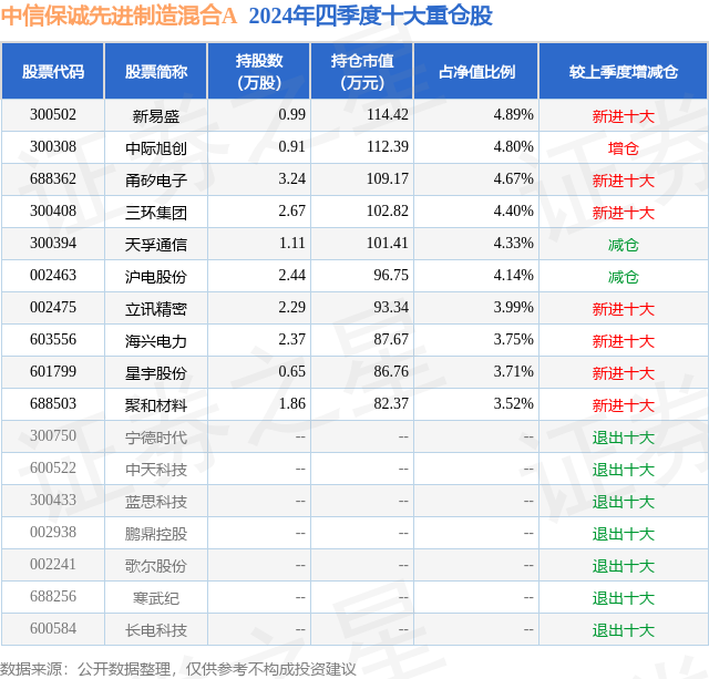 证券之星消息,日前中信保诚先进制造混合A基金公布四季报,2024年四季度最新规模0.15亿元,季度净值涨幅为3.87%。
