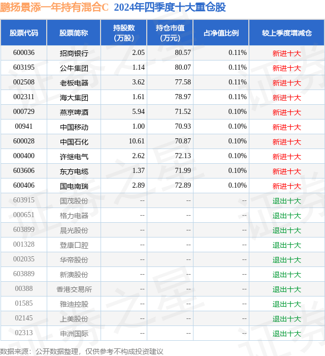 证券之星消息,日前鹏扬景添一年持有混合C基金公布四季报,2024年四季度最新规模5.97亿元,季度净值涨幅为1.22%。
