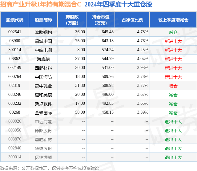从基金规模来看,招商产业升级1年持有期混合C基金2024年四季度公布的基金规模为0.05亿元,较上一期规模628.48万元变化了-100.98万元,环比变化了-16.07%。该基金最新一期资产配置为:股票占净值比90.79%,债券占净值比5.36%,现金占净值比4.05%。从基金持仓来看,该基金当季前十大股票仓位达40.02%,第一大重仓股为鸿路钢构(002541),持仓占比为4.78%。