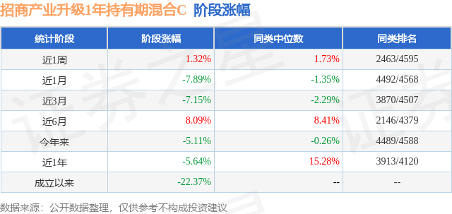 从业绩表现来看,招商产业升级1年持有期混合C基金过去一年净值涨幅为-5.64%,在同类基金中排名3913/4120,同类基金过去一年净值涨幅中位数为15.28%。而基金过去一年的最大回撤为-26.08%,成立以来的最大回撤为-39.7%。