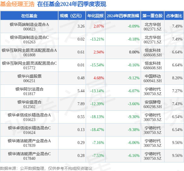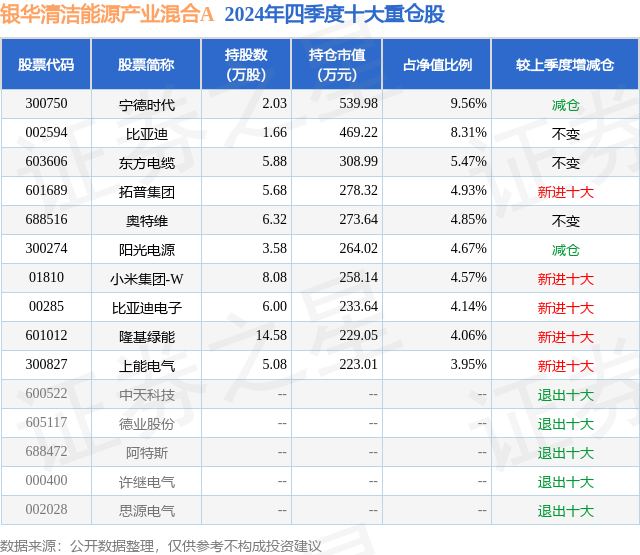 证券之星消息,日前银华清洁能源产业混合A基金公布四季报,2024年四季度最新规模0.29亿元,季度净值涨幅为-6.06%。