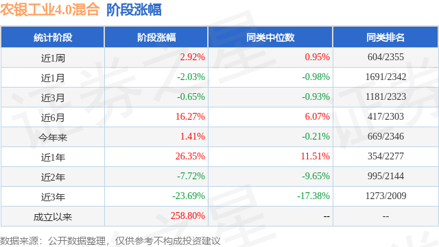从业绩表现来看,农银工业4.0混合基金过去一年净值涨幅为26.35%,在同类基金中排名354/2277,同类基金过去一年净值涨幅中位数为11.51%。而基金过去一年的最大回撤为-17.71%,成立以来的最大回撤为-51.09%。