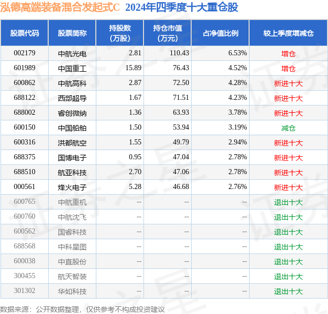 从基金规模来看,泓德高端装备混合发起式C基金2024年四季度公布的基金规模为0.04亿元,较上一期规模213.49万元变化了220.23万元,环比变化了103.15%。该基金最新一期资产配置为:股票占净值比89.46%,无债券类资产,现金占净值比9.95%。从基金持仓来看,该基金当季前十大股票仓位达37.79%,第一大重仓股为中航光电(002179),持仓占比为6.53%。