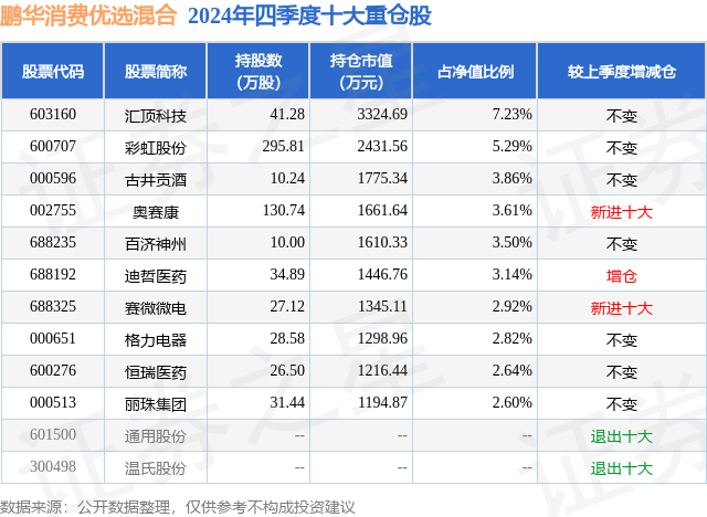 从基金规模来看,鹏华消费优选混合基金2024年四季度公布的基金规模为4.6亿元,较上一期规模4.82亿元变化了-2171.12万元,环比变化了-4.51%。该基金最新一期资产配置为:股票占净值比85.9%,无债券类资产,现金占净值比14.39%。从基金持仓来看,该基金当季前十大股票仓位达37.61%,第一大重仓股为汇顶科技(603160),持仓占比为7.23%。