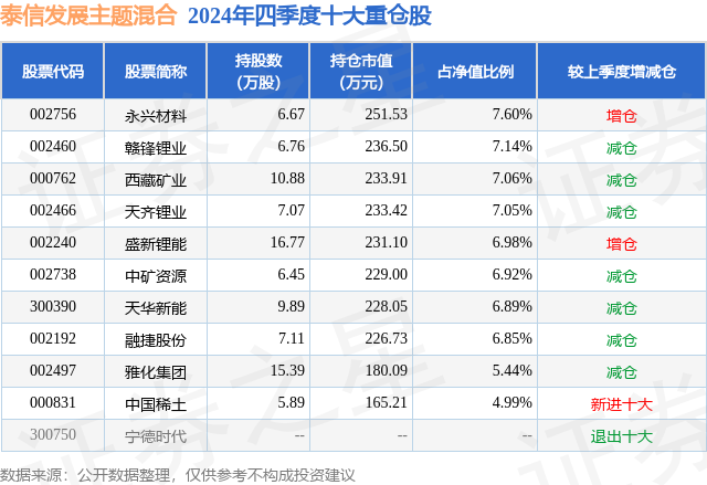 从基金规模来看,泰信发展主题混合基金2024年四季度公布的基金规模为0.33亿元,较上一期规模3651.0万元变化了-339.66万元,环比变化了-9.3%。该基金最新一期资产配置为:股票占净值比83.61%,无债券类资产,现金占净值比16.83%。从基金持仓来看,该基金当季前十大股票仓位达66.92%,第一大重仓股为永兴材料(002756),持仓占比为7.6%。
