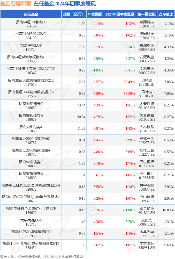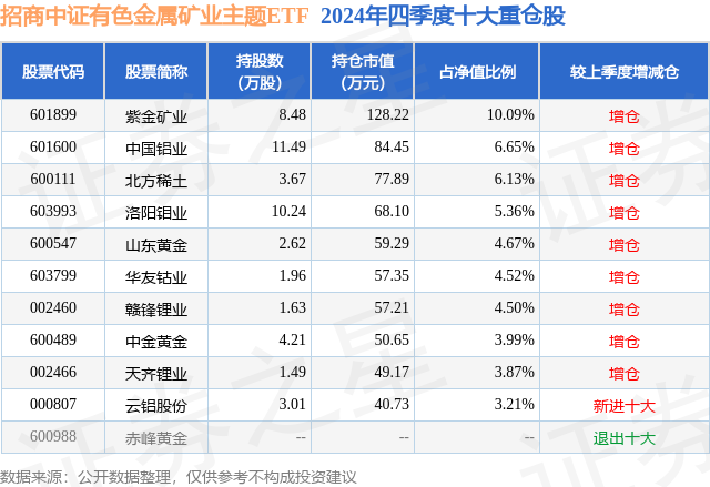 从基金规模来看,招商中证有色金属矿业主题ETF基金2024年四季度公布的基金规模为0.13亿元,较上一期规模1101.98万元变化了168.16万元,环比变化了15.26%。该基金最新一期资产配置为:股票占净值比97.64%,无债券类资产,现金占净值比2.59%。从基金持仓来看,该基金当季前十大股票仓位达52.99%,第一大重仓股为紫金矿业(601899),持仓占比为10.09%。