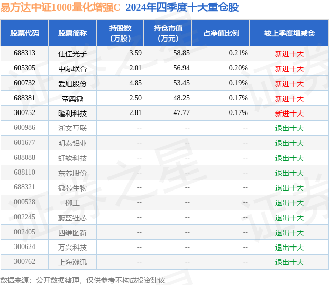 从基金规模来看,易方达中证1000量化增强C基金2024年四季度公布的基金规模为1.21亿元,较上一期规模1.13亿元变化了801.43万元,环比变化了7.1%。该基金最新一期资产配置为:股票占净值比94.34%,债券占净值比0.04%,现金占净值比5.78%。从基金持仓来看,该基金当季前十大股票仓位达0.94%,第一大重仓股为仕佳光子(688313),持仓占比为0.21%。