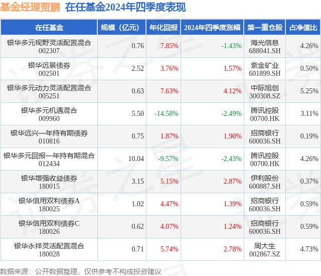 证券之星消息,日前银华信用双利债券A基金公布四季报,2024年四季度最新规模1.02亿元,季度净值涨幅为1.39%。