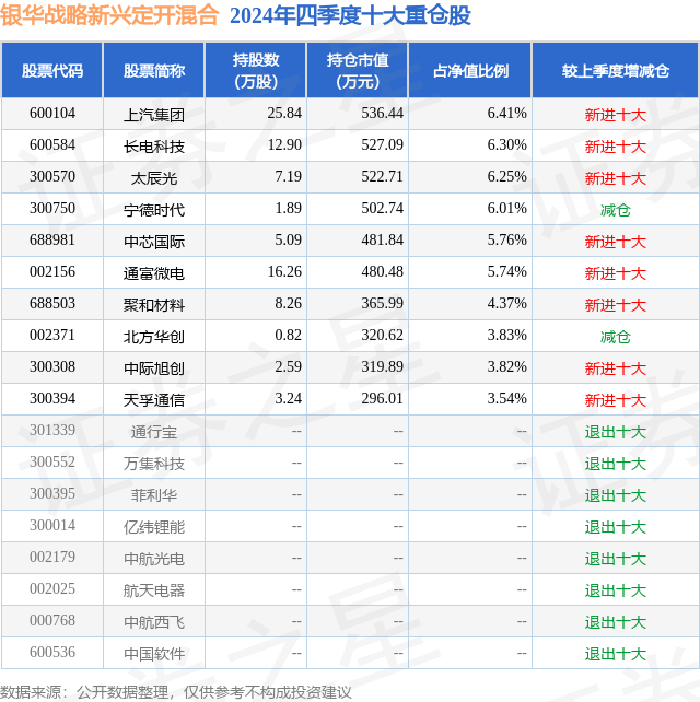 从基金规模来看,银华战略新兴定开混合基金2024年四季度公布的基金规模为0.84亿元,较上一期规模8448.87万元变化了-79.12万元,环比变化了-0.94%。该基金最新一期资产配置为:股票占净值比95.68%,无债券类资产,现金占净值比2.49%。从基金持仓来看,该基金当季前十大股票仓位达52.03%,第一大重仓股为上汽集团(600104),持仓占比为6.41%。