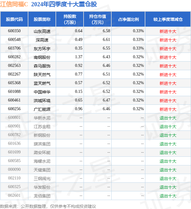 从基金规模来看,江信同福C基金2024年四季度公布的基金规模为0.1亿元,较上一期规模955.99万元变化了35.84万元,环比变化了3.75%。该基金最新一期资产配置为:股票占净值比89.29%,无债券类资产,现金占净值比13.6%。从基金持仓来看,该基金当季前十大股票仓位达3.23%,第一大重仓股为山东高速(600350),持仓占比为0.33%。