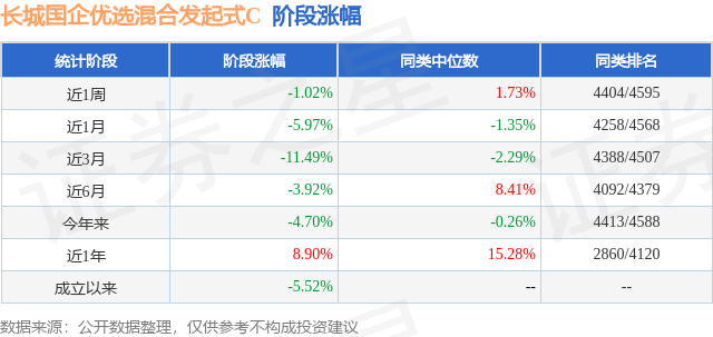 从业绩表现来看,长城国企优选混合发起式C基金过去一年净值涨幅为8.9%,在同类基金中排名2860/4120,同类基金过去一年净值涨幅中位数为15.28%。而基金过去一年的最大回撤为-18.75%,成立以来的最大回撤为-18.75%。