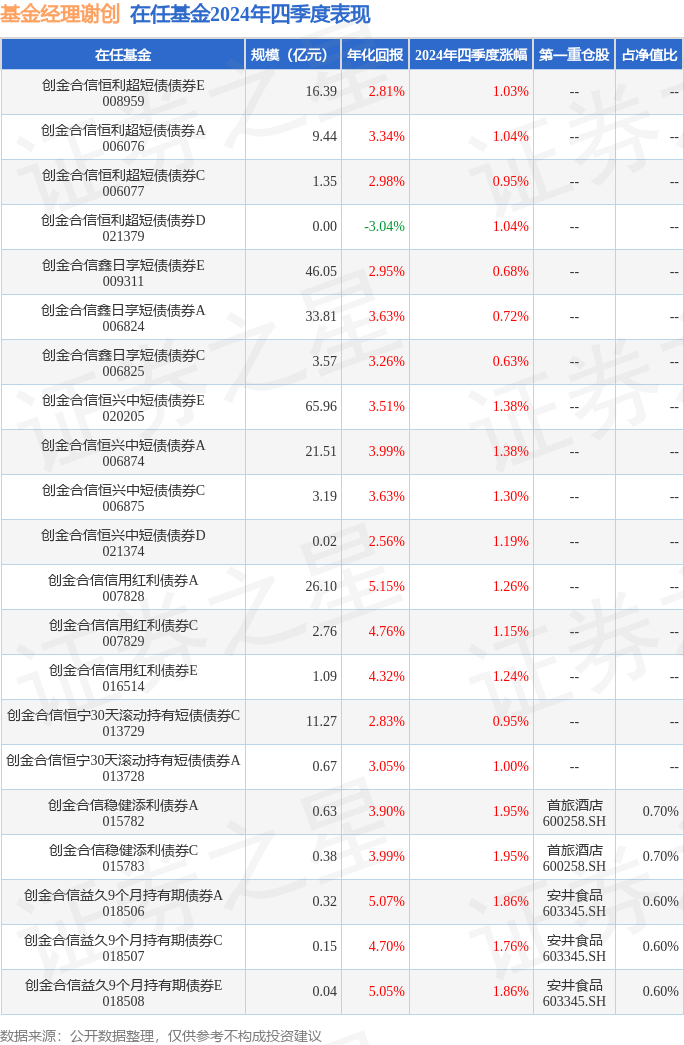 从基金规模来看,创金合信益久9个月持有期债券A基金2024年四季度公布的基金规模为0.32亿元,较上一期规模2933.27万元变化了261.9万元,环比变化了8.93%。该基金最新一期资产配置为:股票占净值比6.56%,债券占净值比87.65%,现金占净值比6.41%。从基金持仓来看,该基金当季前十大股票仓位达3.55%,第一大重仓股为安井食品(603345),持仓占比为0.6%。