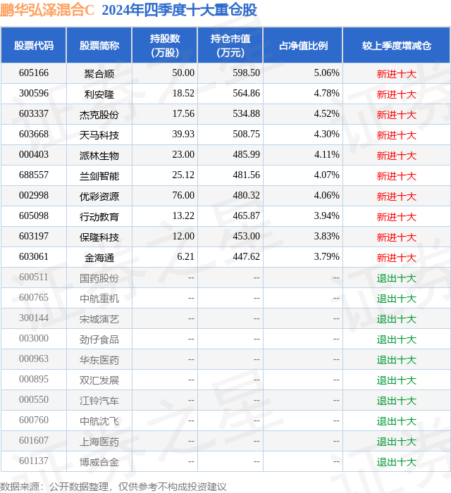 从基金规模来看,鹏华弘泽混合C基金2024年四季度公布的基金规模为0.18亿元,较上一期规模2420.53万元变化了-585.5万元,环比变化了-24.19%。该基金最新一期资产配置为:股票占净值比76.71%,债券占净值比7.45%,现金占净值比4.08%。从基金持仓来看,该基金当季前十大股票仓位达42.46%,第一大重仓股为聚合顺(605166),持仓占比为5.06%。
