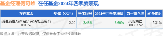 证券之星消息,日前融通新区域新经济灵活配置混合基金公布四季报,2024年四季度最新规模2.2亿元,季度净值涨幅为-6.6%。