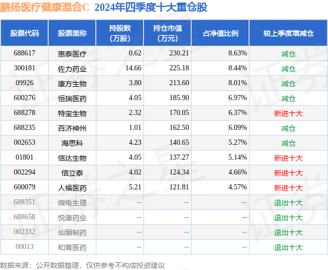 证券之星消息,日前鹏扬医疗健康混合C基金公布四季报,2024年四季度最新规模0.04亿元,季度净值涨幅为-11.95%。