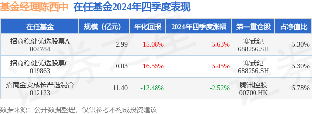 从基金规模来看,招商稳健优选股票C基金2024年四季度公布的基金规模为0.03亿元,较上一期规模243.98万元变化了6.45万元,环比变化了2.64%。该基金最新一期资产配置为:股票占净值比84.98%,债券占净值比0.13%,现金占净值比16.7%。从基金持仓来看,该基金当季前十大股票仓位达33.28%,第一大重仓股为寒武纪(688256),持仓占比为5.3%。