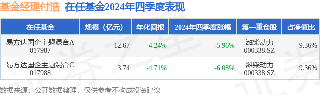 从基金规模来看,易方达国企主题混合A基金2024年四季度公布的基金规模为12.67亿元,较上一期规模14.91亿元变化了-2.24亿元,环比变化了-15.05%。该基金最新一期资产配置为:股票占净值比89.44%,无债券类资产,现金占净值比9.09%。从基金持仓来看,该基金当季前十大股票仓位达56.16%,第一大重仓股为潍柴动力(000338),持仓占比为9.36%。
