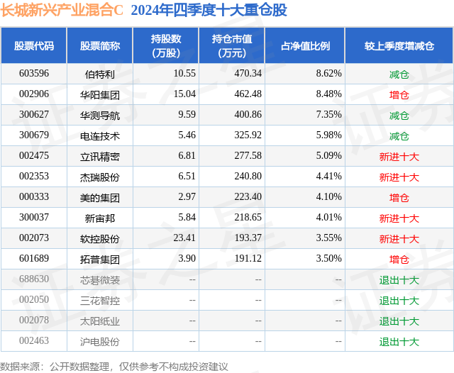 从基金规模来看,长城新兴产业混合C基金2024年四季度公布的基金规模为0.0亿元,较上一期规模3.23万元变化了-1.13万元,环比变化了-34.9%。该基金最新一期资产配置为:股票占净值比84.7%,债券占净值比5.42%,现金占净值比10.09%。从基金持仓来看,该基金当季前十大股票仓位达55.09%,第一大重仓股为伯特利(603596),持仓占比为8.62%。