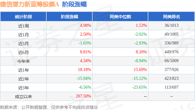 从业绩表现来看,建信潜力新蓝筹股票A基金过去一年净值涨幅为18.18%,在同类基金中排名377/926,同类基金过去一年净值涨幅中位数为15.69%。而基金过去一年的最大回撤为-16.2%,成立以来的最大回撤为-46.02%。