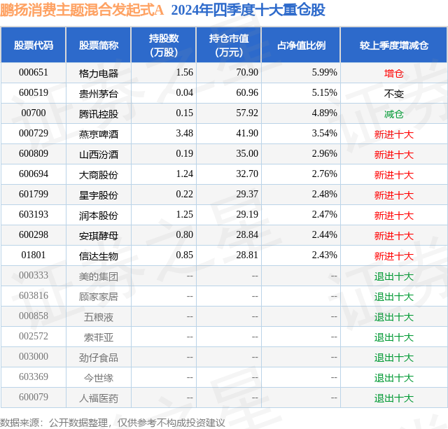 证券之星消息,日前鹏扬消费主题混合发起式A基金公布四季报,2024年四季度最新规模0.12亿元,季度净值涨幅为-4.18%。