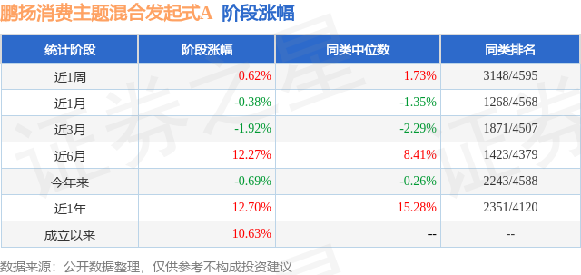 从业绩表现来看,鹏扬消费主题混合发起式A基金过去一年净值涨幅为12.7%,在同类基金中排名2351/4120,同类基金过去一年净值涨幅中位数为15.28%。而基金过去一年的最大回撤为-18.93%,成立以来的最大回撤为-18.93%。