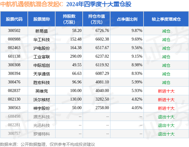 从基金规模来看,中航机遇领航混合发起C基金2024年四季度公布的基金规模为5.65亿元,较上一期规模9.58亿元变化了-3.93亿元,环比变化了-41.03%。该基金最新一期资产配置为:股票占净值比89.53%,无债券类资产,现金占净值比9.43%。从基金持仓来看,该基金当季前十大股票仓位达76.97%,第一大重仓股为新易盛(300502),持仓占比为9.87%。