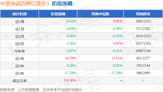从业绩表现来看,中信保诚四季红混合A基金过去一年净值涨幅为14.78%,在同类基金中排名861/2277,同类基金过去一年净值涨幅中位数为11.51%。而基金过去一年的最大回撤为-9.71%,成立以来的最大回撤为-52.82%。