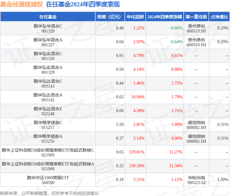 鹏华中证1000增强ETF现任基金经理为寇斌权,近期离任的基金经理为苏俊杰、罗英宇。其中在任基金经理寇斌权已从业1年又217天,2023年12月9日正式接手管理鹏华中证1000增强ETF,任职期间累计回报为5.56%。目前还管理着12只基金产品(包括A类和C类),其中本季度表现最佳的基金为鹏华上证科创板50成份增强策略ETF发起式联接A(021908),季度净值涨幅为11.34%。