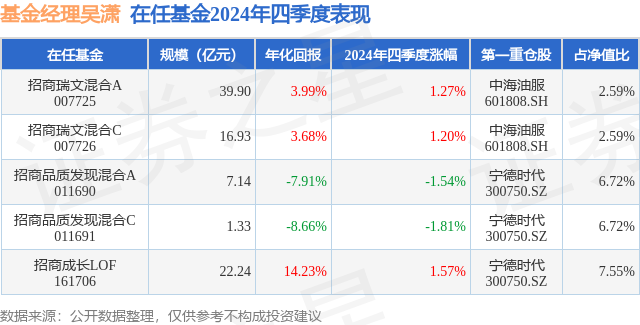 从基金规模来看,招商成长LOF基金2024年四季度公布的基金规模为22.24亿元,较上一期规模19.91亿元变化了2.33亿元,环比变化了11.69%。该基金最新一期资产配置为:股票占净值比92.99%,无债券类资产,现金占净值比7.58%。从基金持仓来看,该基金当季前十大股票仓位达49.16%,第一大重仓股为宁德时代(300750),持仓占比为7.55%。
