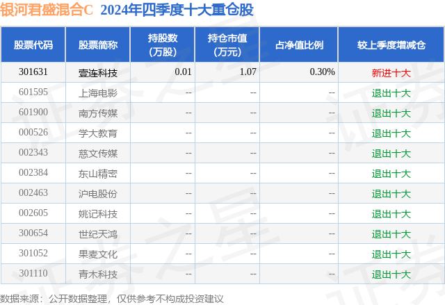 从基金规模来看,银河君盛混合C基金2024年四季度公布的基金规模为0.03亿元,较上一期规模284.95万元变化了4.32万元,环比变化了1.52%。该基金最新一期资产配置为:股票占净值比0.3%,债券占净值比74.03%,现金占净值比31.42%。从基金持仓来看,该基金当季前十大股票仓位达0.3%,第一大重仓股为壹连科技(301631),持仓占比为0.3%。
