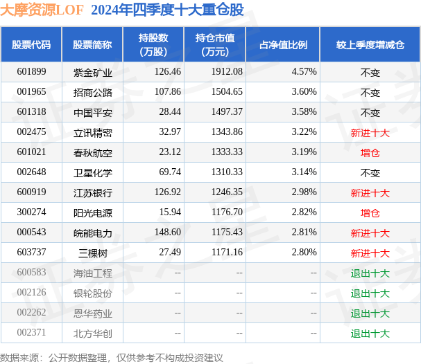 从基金规模来看,大摩资源LOF基金2024年四季度公布的基金规模为4.18亿元,较上一期规模4.49亿元变化了-3147.42万元,环比变化了-7.0%。该基金最新一期资产配置为:股票占净值比90.89%,无债券类资产,现金占净值比9.99%。从基金持仓来看,该基金当季前十大股票仓位达32.71%,第一大重仓股为紫金矿业(601899),持仓占比为4.57%。