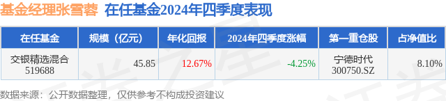 证券之星消息,日前交银精选混合基金公布四季报,2024年四季度最新规模45.85亿元,季度净值涨幅为-4.25%。