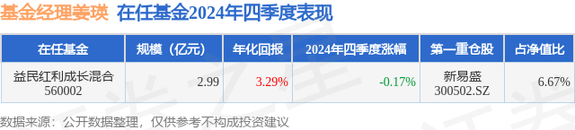 证券之星消息,日前益民红利成长混合基金公布四季报,2024年四季度最新规模2.99亿元,季度净值涨幅为-0.17%。