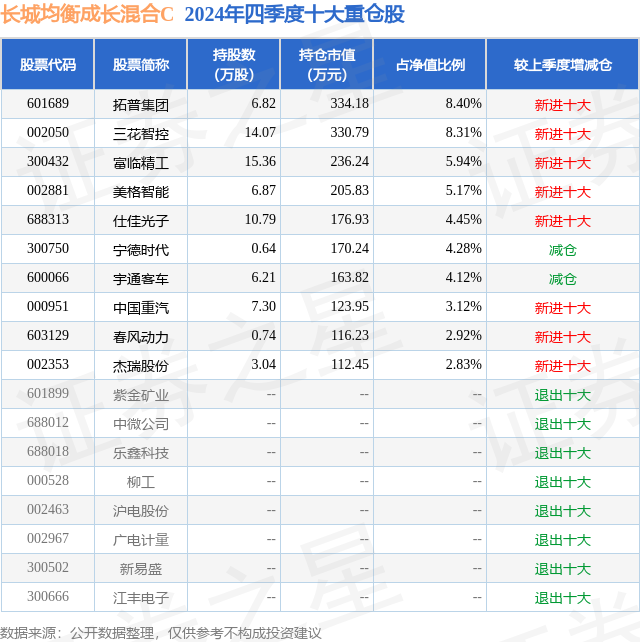 从基金规模来看,长城均衡成长混合C基金2024年四季度公布的基金规模为0.18亿元,较上一期规模5891.1万元变化了-4082.04万元,环比变化了-69.29%。该基金最新一期资产配置为:股票占净值比86.27%,无债券类资产,现金占净值比6.33%。从基金持仓来看,该基金当季前十大股票仓位达49.54%,第一大重仓股为拓普集团(601689),持仓占比为8.4%。