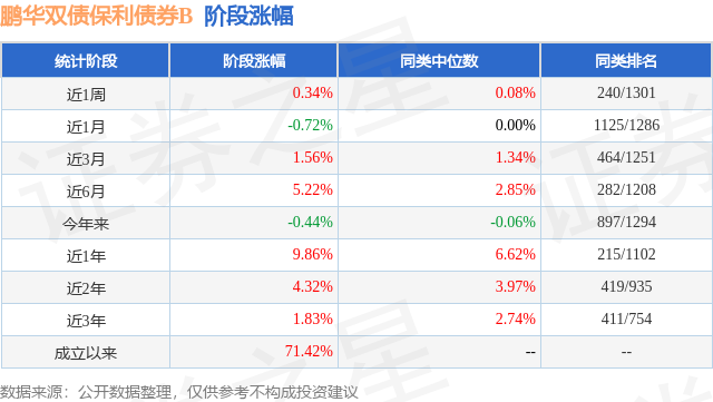 从业绩表现来看,鹏华双债保利债券B基金过去一年净值涨幅为9.86%,在同类基金中排名215/1102,同类基金过去一年净值涨幅中位数为6.62%。而基金过去一年的最大回撤为-4.93%,成立以来的最大回撤为-10.12%。
